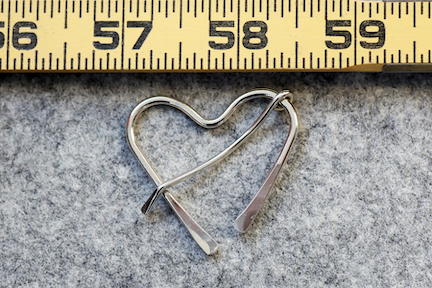 At less than an ounce, this pin is light enough to be used on the most delicate lace, but sturdy enough to use on a sweater. This Heart Penannular is based on the design of the ancient penannular brooch, with an arm that slides around the thinner portion of the pin body. The arm (which cannot be removed from the pin) is inserted through the material and the pin slides to lock into place. There is no spring in this style, as the pin is engineered to use the thickness of fabric to stay clasped! Pins are smoothed, work hardened, and polished, and have a blunt tip made specifically for use on hand- or larger gauge machine-knits. All pins are designed and handmade by Romi in the US. Pin is shown in nickel.