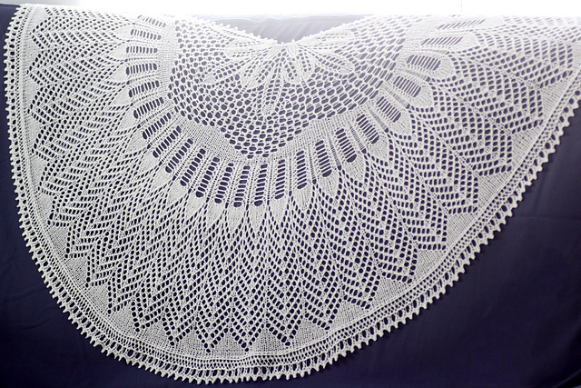 Used in the “Winter’s Moon” shawl design (one skein for the shawl shown) from Romi’s 2013 Pins & Lace Club, this yarn is from Sincere Sheep. A beautiful 100% Rambouillet breed specific wool from Wyoming, this is a squishy and bouncy fingering weight yarn, with 760 yards per 6 ounce skein, and two plies.